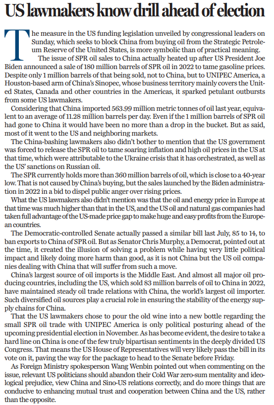 上周日,美国国会领导人通过一项政府开支法案,其中包括阻止中国从“战略石油储备”(SPR)购买石油。这一行为的象征意义,远大于实际意义。