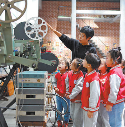 湖州市南浔镇横街电影博物馆内,老师带领孩子们了解电影放映机。