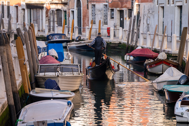 意大利威尼斯一名船夫在贡多拉上运送游客。(资料图)