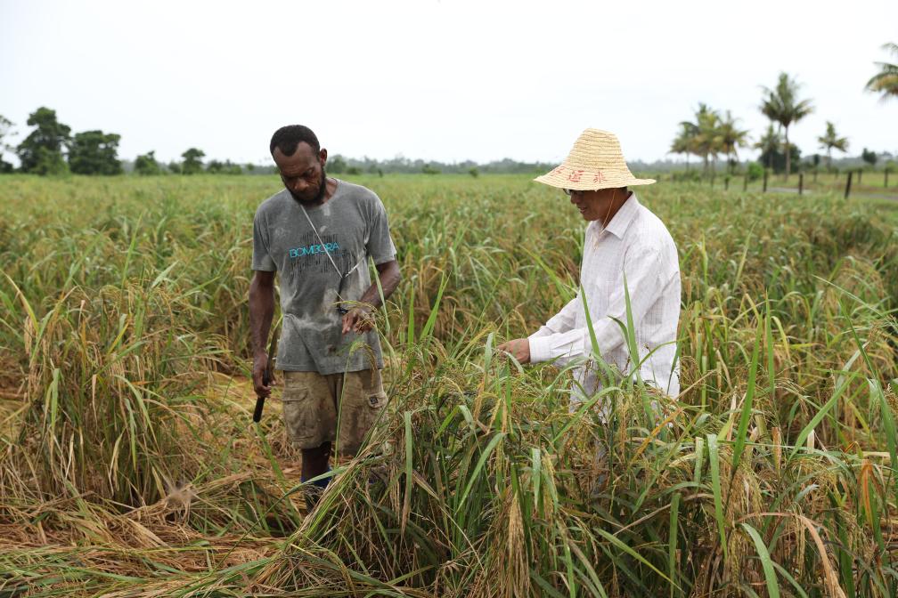 3月13日,在太平洋岛国斐济瑙索里镇,中国专家(右)在中国援斐济农业发展技术水稻项目试验示范培训基地查看暴雨过后水稻倒伏情况。新华社发(桑钦龙摄)
